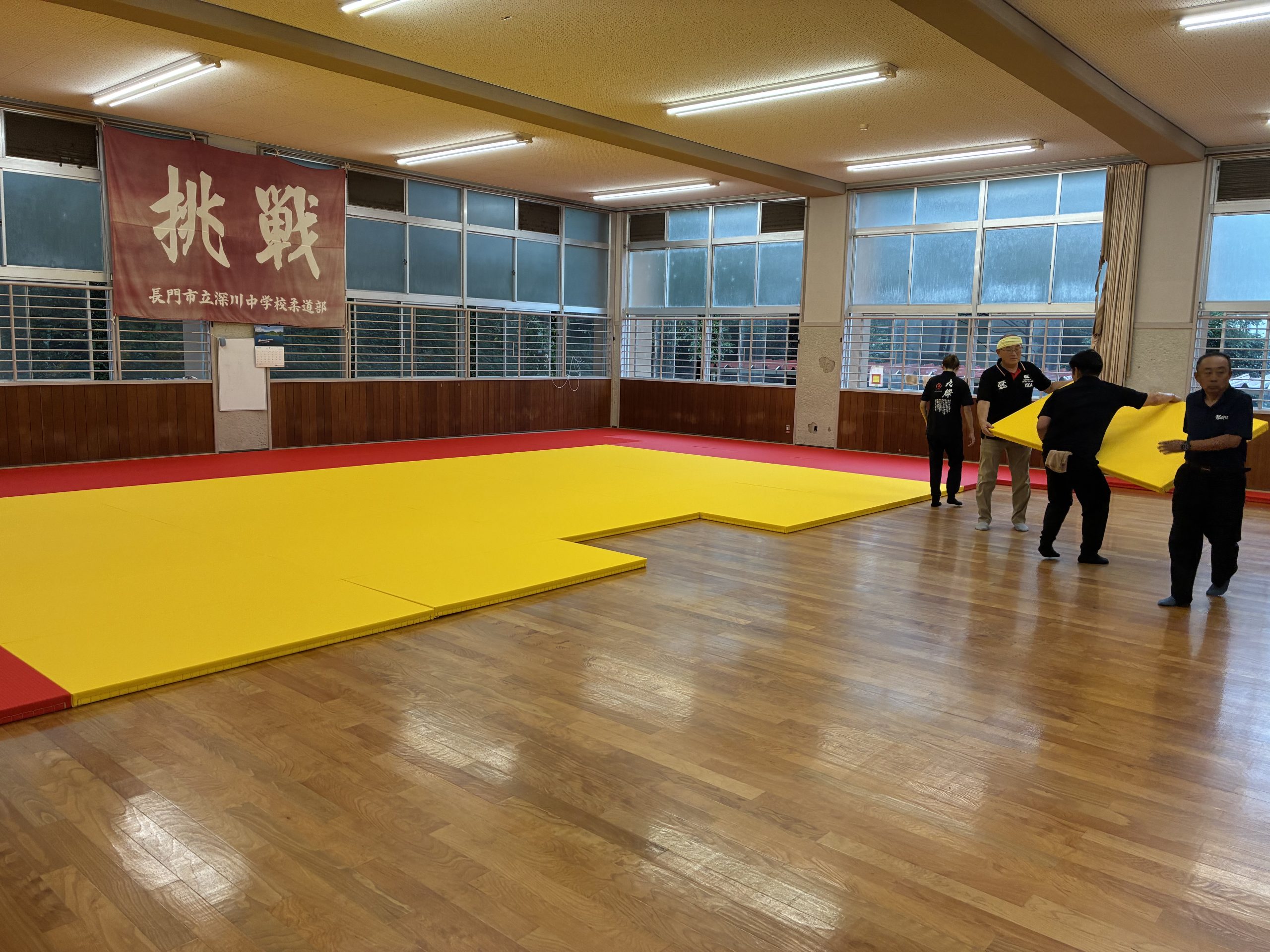 9月10日(水)の午前中、体育館1階の武道場に柔道畳が搬入されました。場内は黄色、場外は赤の2色で100畳以上あるそうです。体育科の教員と業者の方などで1時間以上かけて敷き詰め、柔道場が完成しました。畳のおかげで、古くなった体育館の一部が、とても新しくなった印象を受けます。