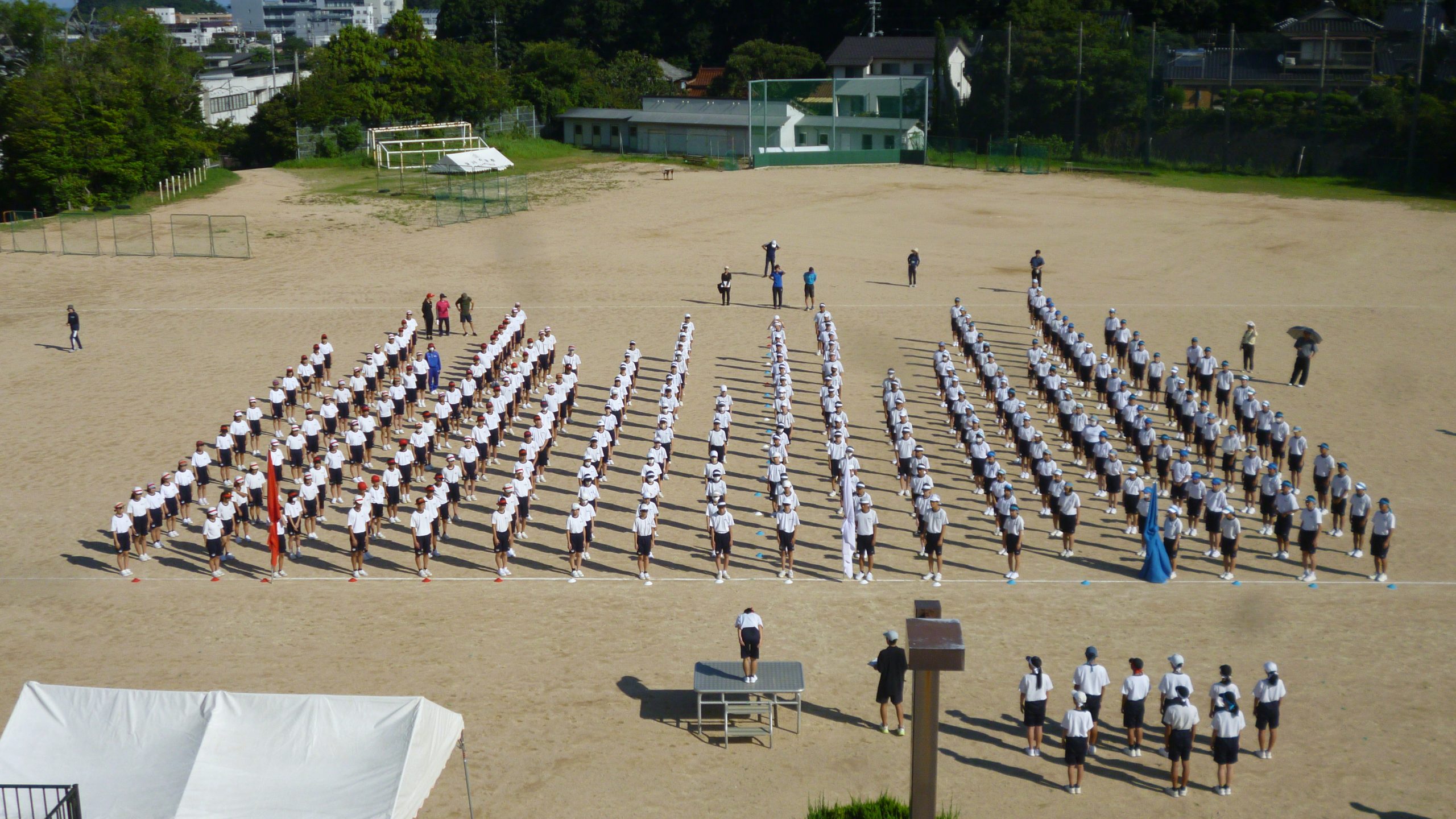 9月17日(水)から本格的に体育祭の練習と準備が始まっています。今年度は生徒の疲労や熱中症予防に配慮して、1~3校時の体育祭練習の時間を充て、4校時以降は授業を行っています。写真は初日の開会式の練習風景です。全校生徒が整列をしてのスタートとなりました。