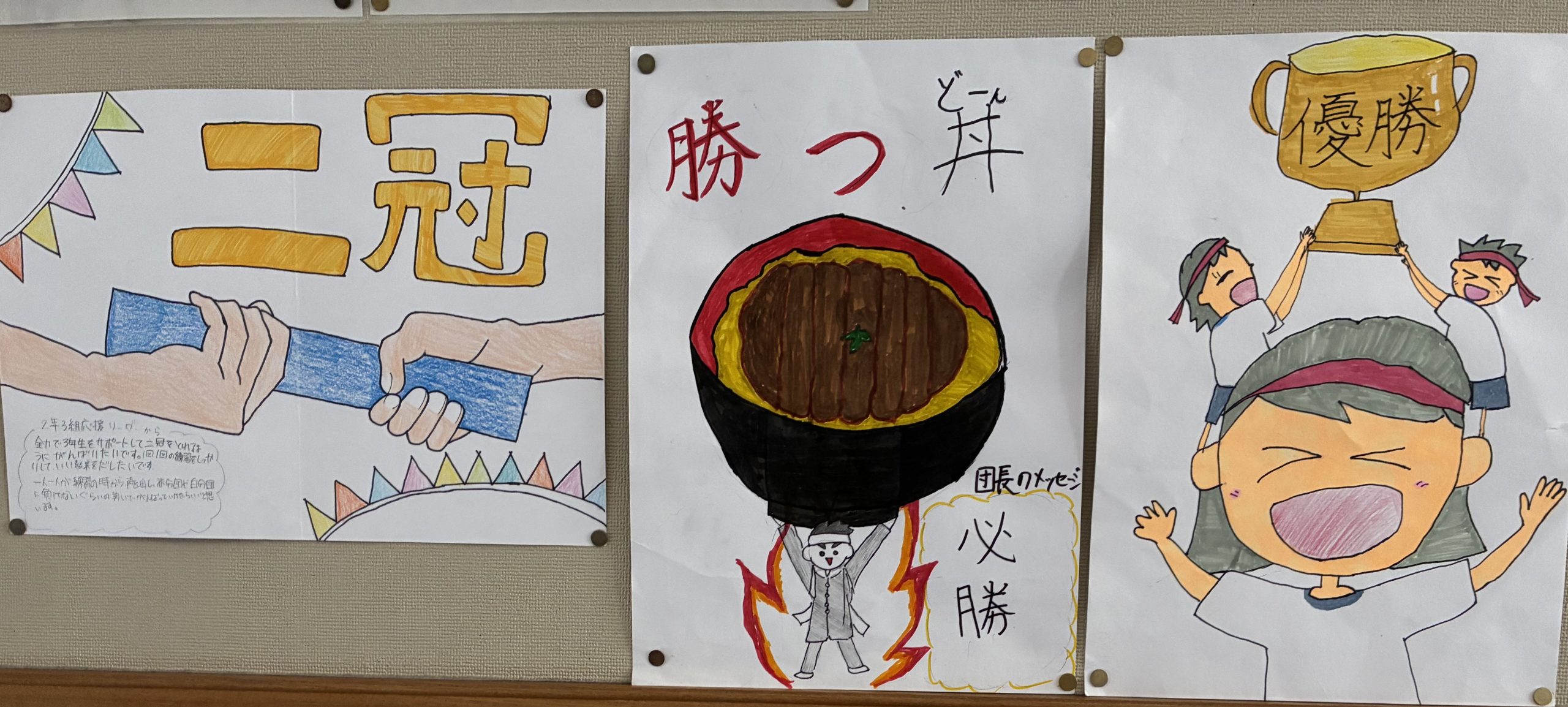 朝は曇り空です。湿度がやや高いものの生徒にとっては過ごしやすい1日ではないでしょうか。写真は、2年生の広報委員が作成した体育祭の士気を高めるためのポスターです。(1・3年生も掲示してあります。)各分団、一丸となってすばらしい大会にしてほしいと思います。