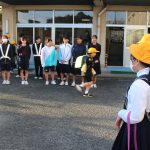 11月初旬から中旬にかけて、深川小学校へ中学生の歌声を届けに行きました。10月の文化祭で開催した合唱コンクールの各学年金賞受賞学級が、昼休み時間に深川小体育館に出向き、合唱を披露していきました。写真は1年生の合唱風景です。