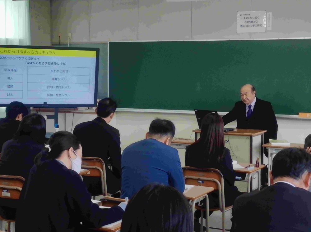 12月25日(木)の午後から、校内研修会を実施しました。講師として山口短期大学の加藤浩久教授をお招きし、「コミュニティスクールはどこへ向かうべきか」と題したご講話をいただきました。学習指導要領改訂の進捗状況と本来の学校教育の在り方という二つの視点から、とても刺激的なお話をいただきました。(他校や教育委員会からも受講者がありました。)