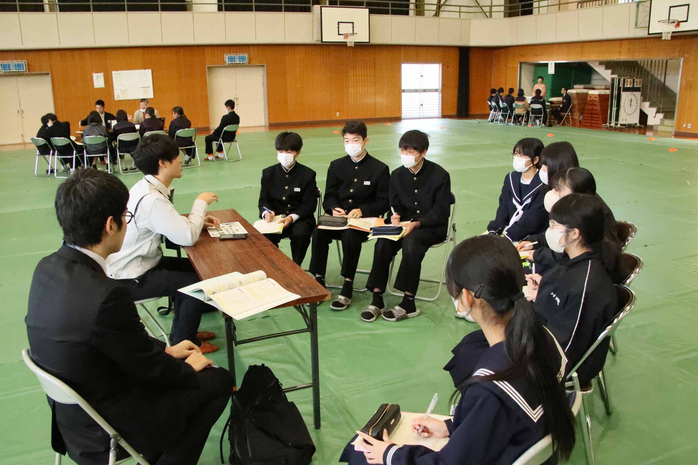 今日のトピックス3月17日(火)の午前中、市内の中学1年生を対象とした「長門しごと発見プログラム」が本校を会場に開催されました。本校生徒も含めて200人以上の中学1年生が集まり、市内で働く大人からの話を聞いて学ぶプログラムです。朝から33人の職業人が集まられ、アイスブレークなどを経た後、ブースごとに分かれて中学生にわかりやすく自分の仕事に対する思いなどを語っておられました。