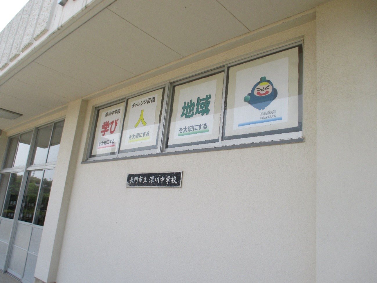 昨日、本日の2日間保護者懇談会を行っています。御来校いただいた保護者の皆様、ありがとうございます。出入口となっている生徒昇降口の写真です。ここには本校のチャレンジ目標が掲げられています。昨年度末にきれいにリニューアルしました。深川中学校は学び(授業の充実)、人(特にさわやかな挨拶)、地域(長門に学び貢献しようとする意欲)を大切にする学校でありたい!この目標と“ふかまるくん”が日々子どもたちを見守っています。