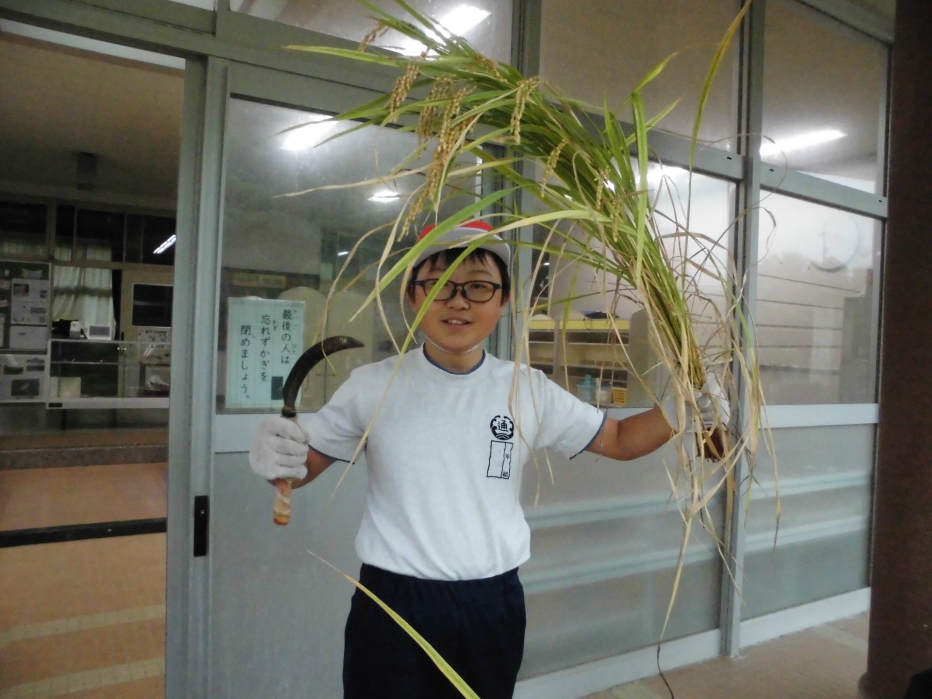 6月に植えた稲の収穫をしました。みんな、稲刈り体験は初めてです。慎重に鎌を操作して刈り取り、1週間干しました。