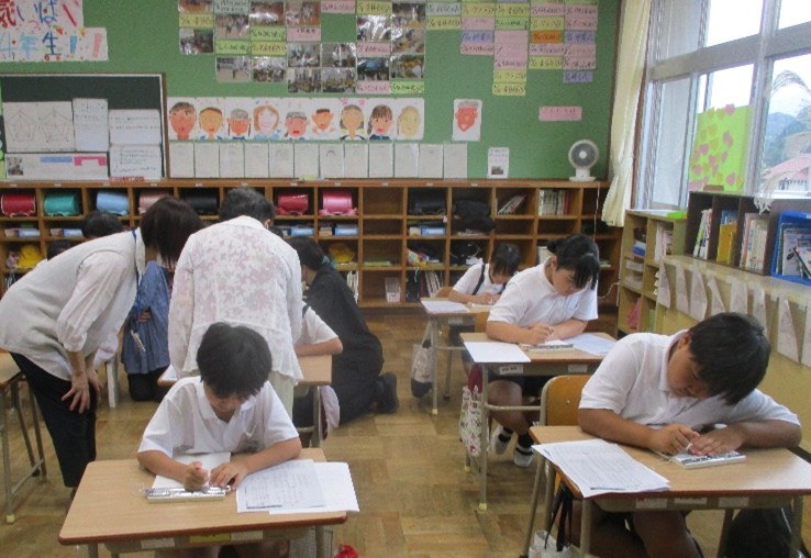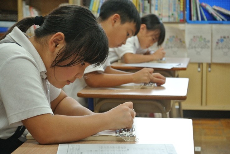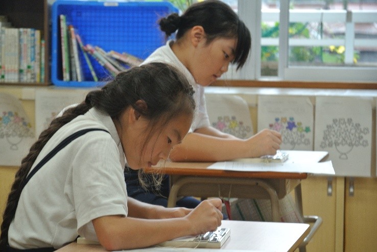 先日、4年生が総合的な学習の時間に、点字について学びました。社会福祉協議会や点訳ひまわりの会のみなさんに来ていただき、点字の読み方やうち方を指導していただきました。子供たちが学習を振り返って、はじめは苦戦していましたが、あきらめることなく取り組み、自分の名前をうつことができたと発表したように、一生懸命取り組む姿がよく見られました。