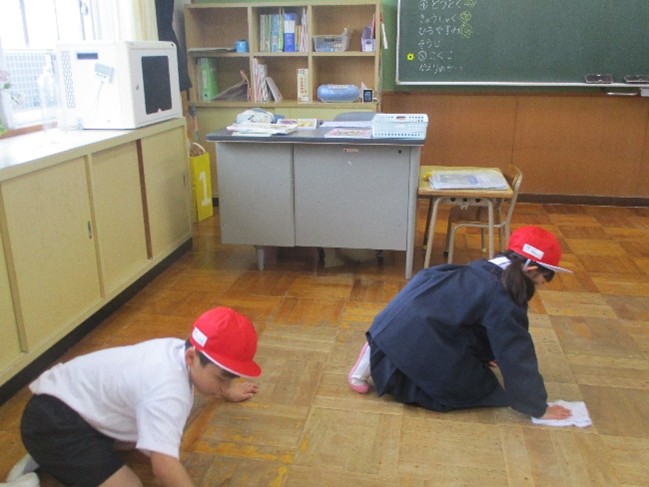 今日も1年生と一緒に掃除を行いました。6年生は教え方を工夫して取り組みました。1年生はお兄さんお姉さんのアドバイスや前回の掃除を思い出しながら一生懸命に掃除を行いました。