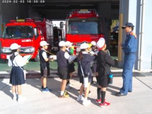 11月10・13日、3年生が社会の「くらしを守る」の学習で、長門消防署を見学させてもらいました。私たちの安全な生活を守るために、消防署のみなさんが日ごろどのようなことをしているのか、実際に道具を見せてもらいながら、お話を聞いて学びを深めしました。