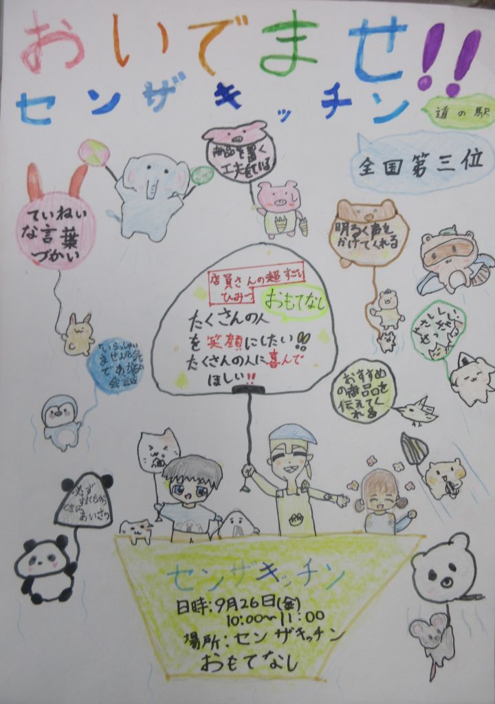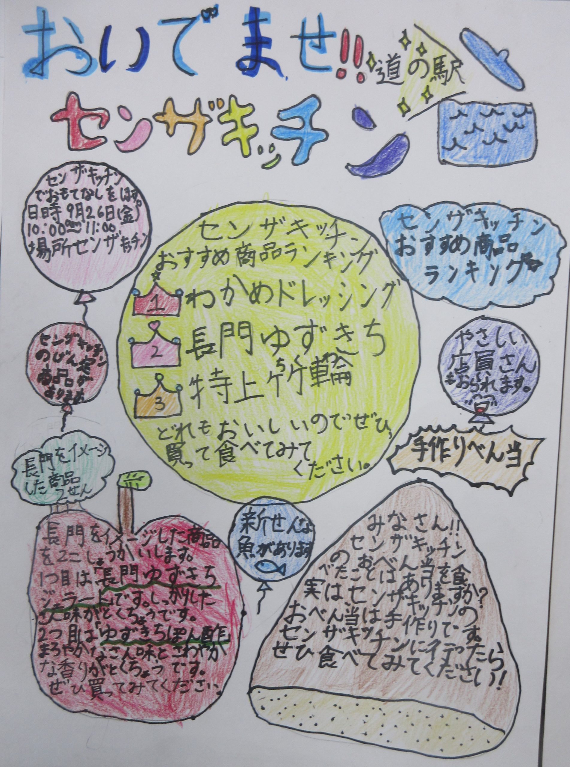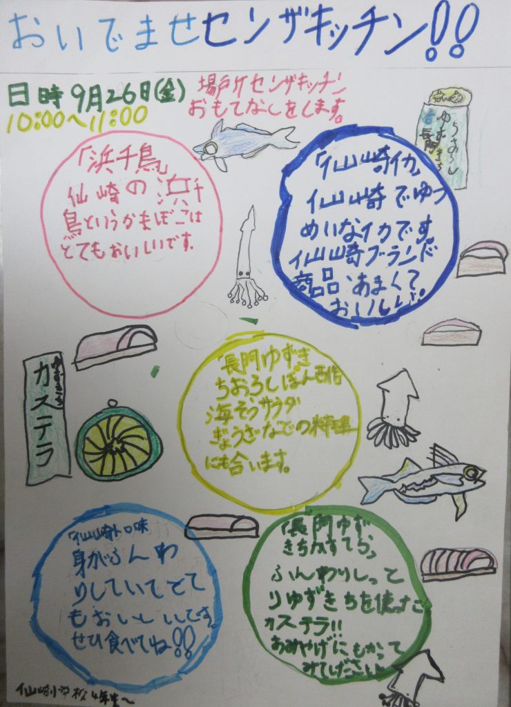 4年生が「センザキッチン」へ。みなさん、お越しくださいね。4年生、手作りポスターです。