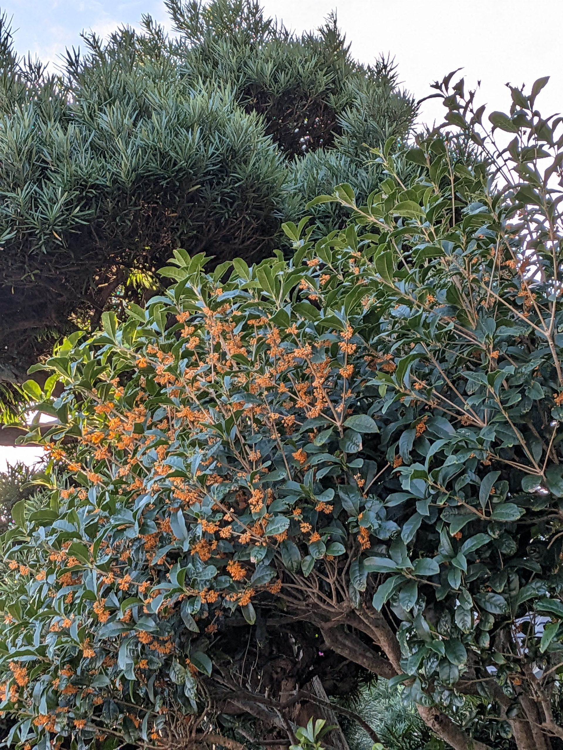 運動場にいると、やさしく甘いかおりが心を包みます。学校近くのお庭を見ると、そこにはキンモクセイ。このかおり、やっぱり好きです。