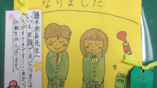 明日は、中学校の卒業式です。中学3年生にとっては、小中合わせて最後の給食。人気の鶏のから揚げとお汁のなかにお祝いなるとです。 校長室の机には、6年生からのおまもり。 3月のみすゞさんの詩「このみち」。たくさんの子どもたちがチャレンジしていま...